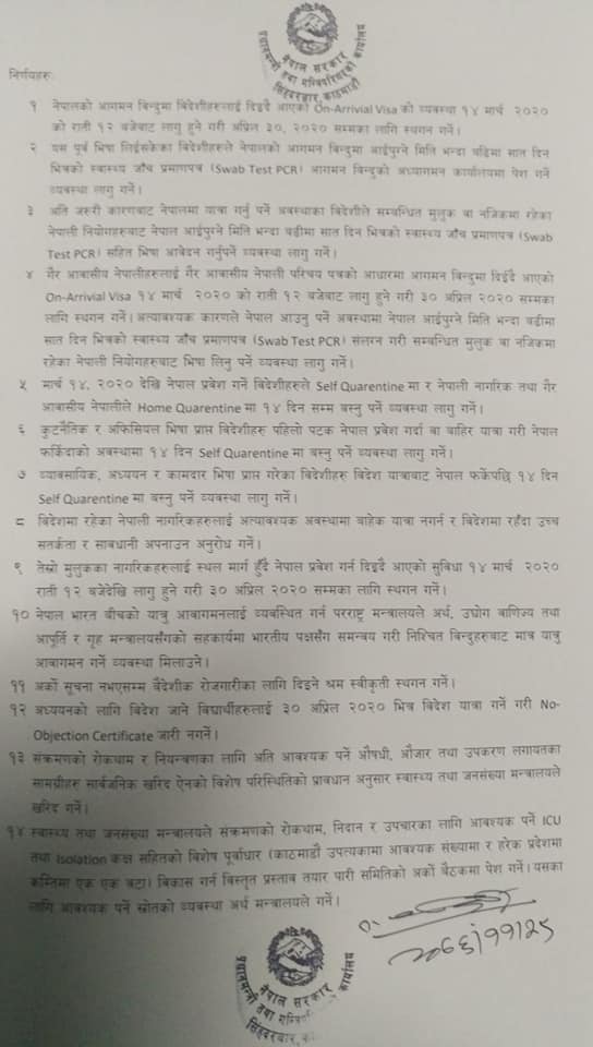 १. नेपाल आगमन विन्दुमा विदेशीहरूलाई दिइँदै आएको अन अराइभल भिसाको व्यवस्था १४ मार्च २०२०को राति १२ बजेबाट लागु हुने गरी अप्रिल ३० २०२० सम्मका लागि स्थगन गर्ने ।