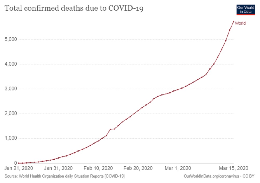 हालसम्म ६ हजार पाँच सय १५ जनाको ज्यान गइसकेको विश्व स्वास्थ्य संगठनले जनाएको छ । एकै दिनमा कोरोनाले ६ सय ८२ जनाको मृत्यु भएको छ । इटालीमा मात्रै विगत २४ घण्टामा ३ सय ६८ जनाले ज्यान गुमाएका छन् । इरानमा पनि थप एक सय १३ जनाको मृत्यु भएको छ ।