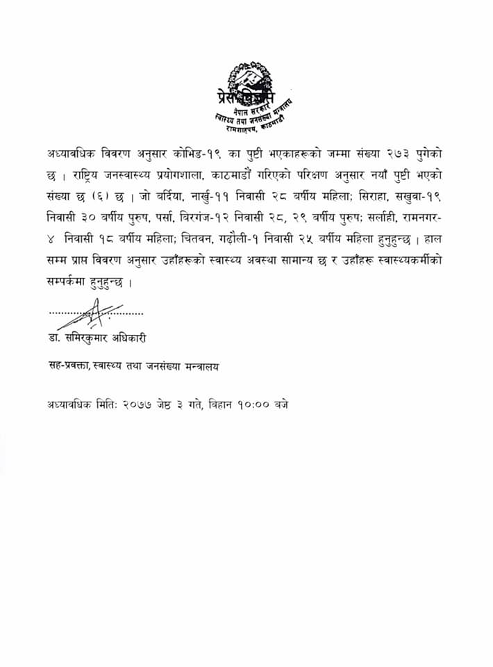 मन्त्रालयका अनुसार बर्दियाको नार्खु-११ निवासी २८ वर्षीय महिला, सिरहाको सखुवा–१९ निवासी ३० वर्षीय पुरुष, , पर्साको वीरगन्ज निवासी २८ र २९ वर्षीय पुरुष, सर्लाहीको रामनगर-४ निवासी १८ वर्षीया महिला र चितवनको गढौली–१ निवासी २५ वर्षीय महिलामा कोरोना पुष्टि भएको हो ।