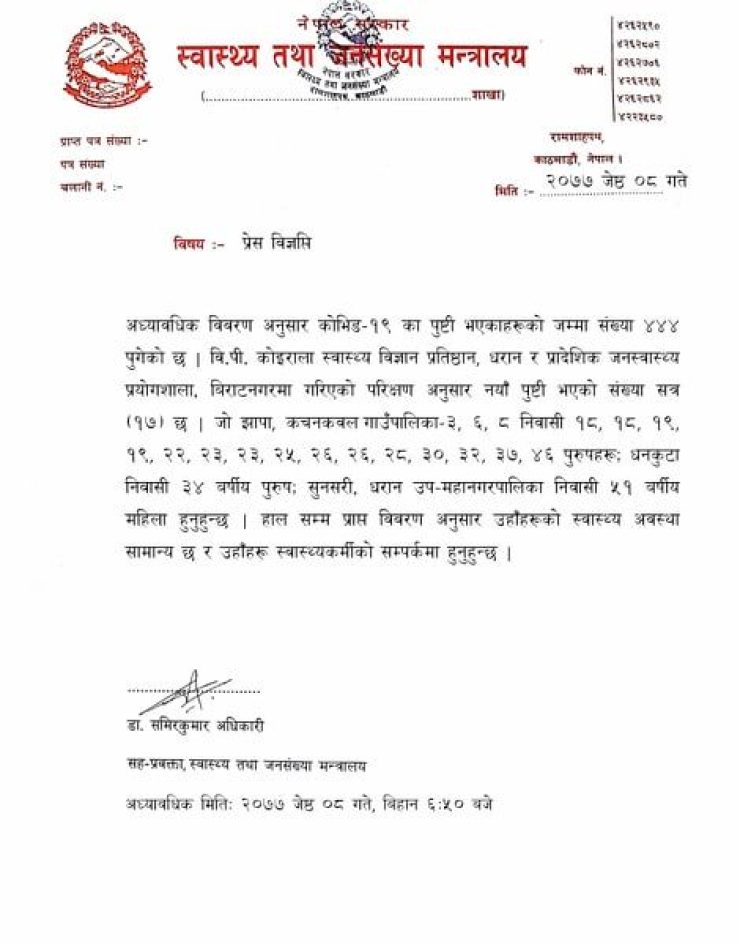 बिहीबार बिहान प्रेस विज्ञप्ति जारी गर्दै मन्त्रालयले थप १७ जनामा कोरोना भेटिएको जानकारी दिएको हो । मन्त्रालयका अनुसार संक्रमितहरु झापा, धनकुटा र सुनसरी जिल्लाका रहेका छन् ।