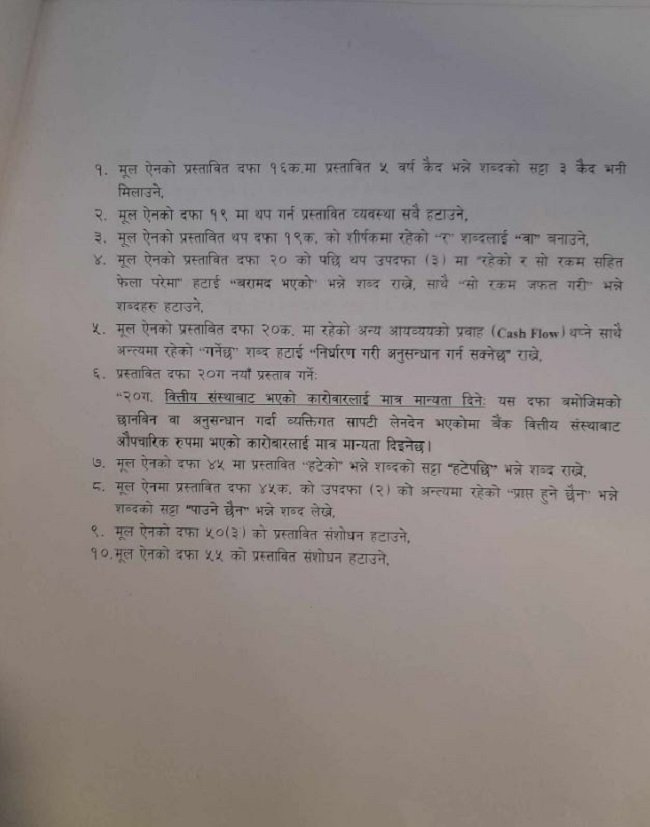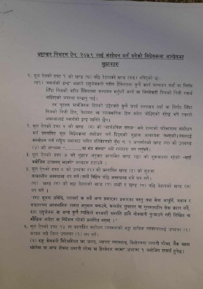 यस्तै राष्ट्र सेवकले विदेशमा घर जग्गा, व्यापार व्यवसाय, धितोपत्रमा लगानी गरेमा बैंक खाता खोलेमा वा अन्य क्षेत्रमा लगानी गरेमा वा हिस्सेदार भएमा सजाय हुनुपर्ने प्रस्ताव अख्तियारको छ । यसैगरी मुल ऐनको प्रस्तावित दफा १६ (क) मा प्रस्तावित ५ वर्ष कैद भन्ने शब्दको सट्टा ३ वर्ष कैद भनि मिलाउने, वित्तीय संस्थाबाट भएको कारबारलाई मात्रै मान्यता दिनेलगायतको सुझाव अख्तियारले दिएको छ ।