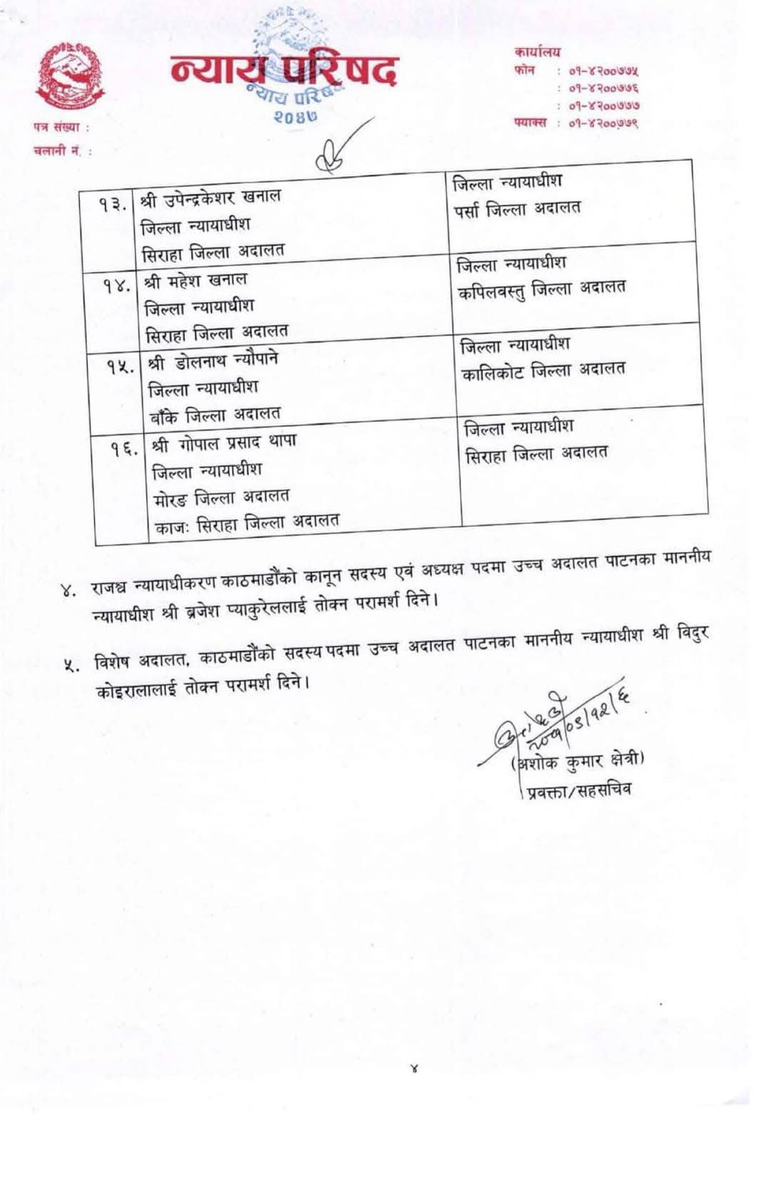 शुक्रबार बसेको परिषद् बैठकले उच्च अदालतका ९ र जिल्ला अदालतका १६ न्यायाधीशको सरुवाका लागि सिफारिस गरेको छ ।