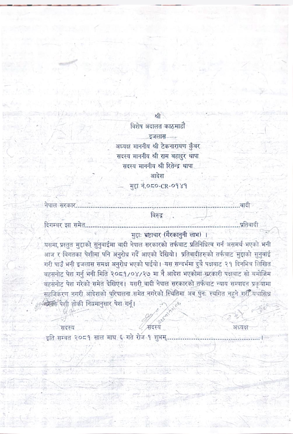 आईतबार भएको आदेशमा उल्लेख छ ,‘यसमा प्रस्तुत मुद्दाको सुनुवाइमा वादी नेपाल सरकारको तर्फबाट प्रतिनिधित्व गर्न असमर्थ भएको भनी आज र विगतका पेशीमा पनि अनुरोध गर्दै आएको देखियो । प्रतिवादीहरूको तर्फबाट मुद्दाको सुनुवाइ गरी पाऊँ भनी इजलाससमक्ष अनुरोध भएको पाइयो । यस सन्दर्भमा दुवै पक्षबाट २१ दिनभित्र लिखित बहसनोट पेश गर्नू भनी मिति २०८१ साउन २७ मा नै आदेश भएकोमा सरकारी पक्षबाट सोबमोजिम बहसनोट पेश गरेको समेत देखिएन । यसरी बादी नेपाल सरकारको तर्फबाट न्याय सम्पादन प्रक्रियामा सहजीकरण नगरी आदेशको परिपालना समेत नगरेको स्थितिमा अब पुनः स्थगित नहुने गरी यथाशीघ्र पेशी तोकी नियमानुसार पेश गर्नू ।’