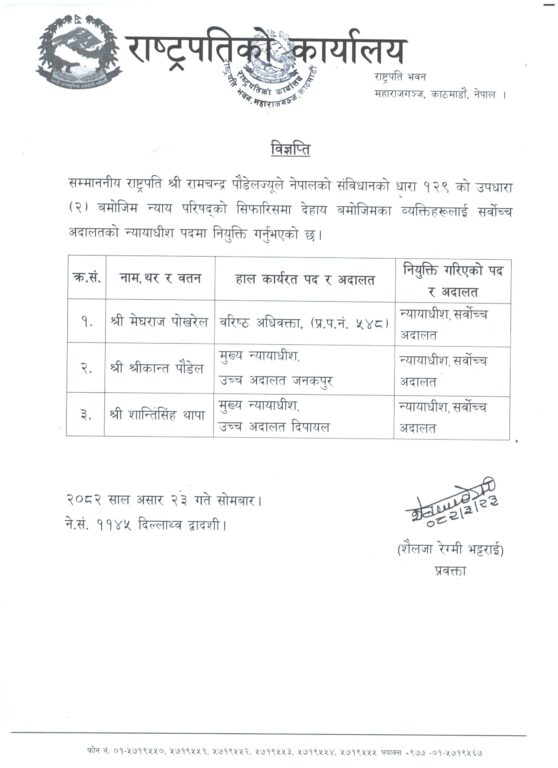 राष्ट्रपति पौडेलले मेघराज पोखरेल, श्रीकान्त पौडेल र शान्तिसिंह थापालाई सर्वोच्च अदालतको न्यायाधीश नियुक्त गरेको राष्ट्रपति कार्यालयकी प्रवक्ता शैलजा रेग्मी भट्टराईले जानकारी दिइन् ।