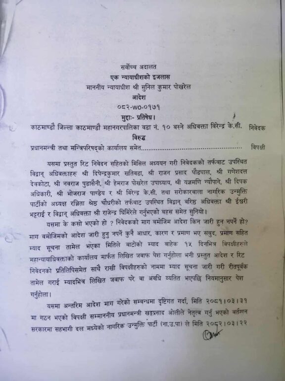 रिटमाथि प्रारम्भिक सुनुवाइ गर्दै न्यायाधीश पोखरेलको इजलासले विपक्षीका नाममा कारण देखाउ आदेश जारी गरेको छ । अन्तरिम आदेश जारी गर्ने कि नगर्ने भनेर छलफल गर्न भदौ ११ गते दुवै पक्षलाई बोलाइएको सर्वाेच्चले जनाएको छ ।