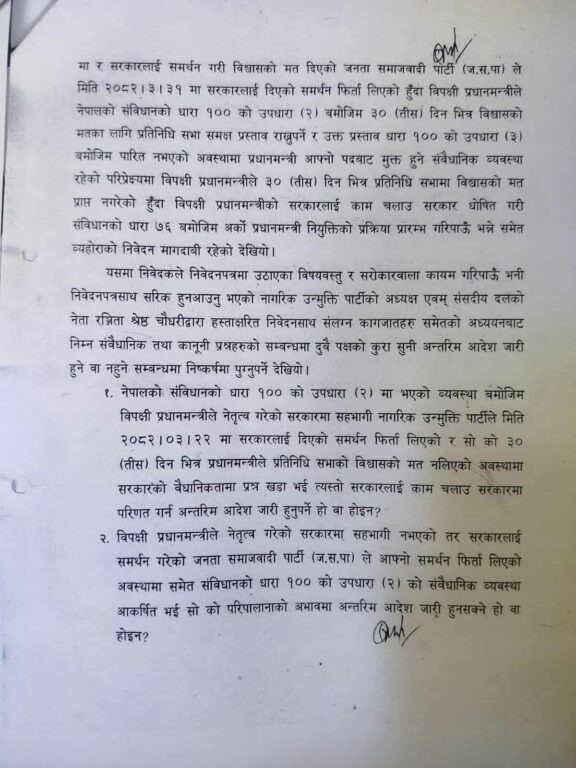 नागरिक उन्मुक्ति पार्टी (नाउपा) ले गत असार २२ गते सरकारलाई दिएको समर्थन फिर्ता लिएको ३० दिनभित्र ओलीले विश्वासको मत नलिएको हुँदा सरकार अल्पमतमा परेको भन्दै भदौ ५ गते सर्वोच्चमा रिट दायर भएको थियो ।