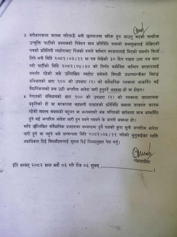 न्यायाधीश सुनिलकुमार पोखरेलको इजलासले ४ बुँदे जवाफ माग्दै प्रधानमन्त्री ओलीलाई प्रश्न गरेको छ ।
