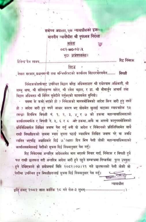 न्यायाधीश नृपध्वज निरौलाको इजलासले सोमबार कारण देखाऊ आदेश जारी गर्दै लिखित जवाफ पेश भएपछि अग्राधिकार दिई ७ दिनभित्र पेशी तोक्न आदेश गरेको छ ।