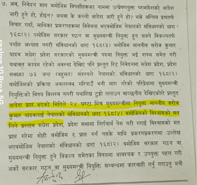 मुख्यमन्त्री यादवले विश्वासको मत प्राप्त गरेमा सोही बमोजिम हुने र विश्वास प्राप्त नगरे दुई वा दुईभन्दा बढी दलको समर्थनमा नयाँ सरकार गठनको विकल्पमा जान आदेश गरिएको छ ।