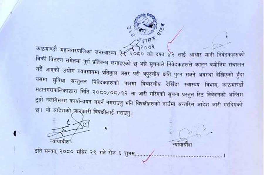अदालतको आदेशमा उल्लेख छ, ‘सुविधा सन्तुलन निवेदकहरूको पक्षमा विचारणीय देखिँदा स्वास्थ्य विभाग काठमाडौं महानगरपालिकाद्वारा १२ मंसिर २०८० मा जारी गरिएको सूचना प्रस्तुत रिट निवेदनको अन्तिम टुंगो नलागेसम्म कार्यान्वयन नगर्न नगराउनू भनी विपक्षीहरूको नाउँमा अन्तरिम आदेश जारी गरिदिएको छ ।’