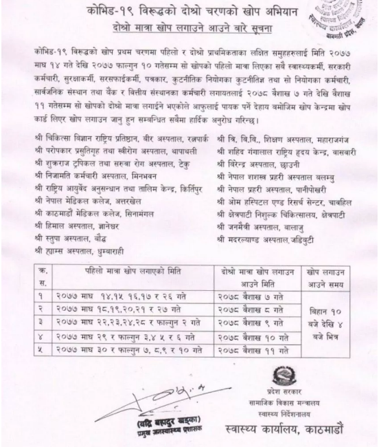 स्वास्थ्य तथा जनसंख्या मन्त्रालयले गत माघ १४ देखि फागुन १० गतेसम्म पहिलो डोज खोप लगाएकाहरुलाई बैशाख ७ देखि ११ गतेसम्म दोस्रो डोज खोप लगाउने भएको हो । स्वास्थ्य मन्त्रालयले आफुलाई पायक पर्ने नजिकको केन्द्रमा गएर खोप लगाउन आग्रह गरेको छ ।