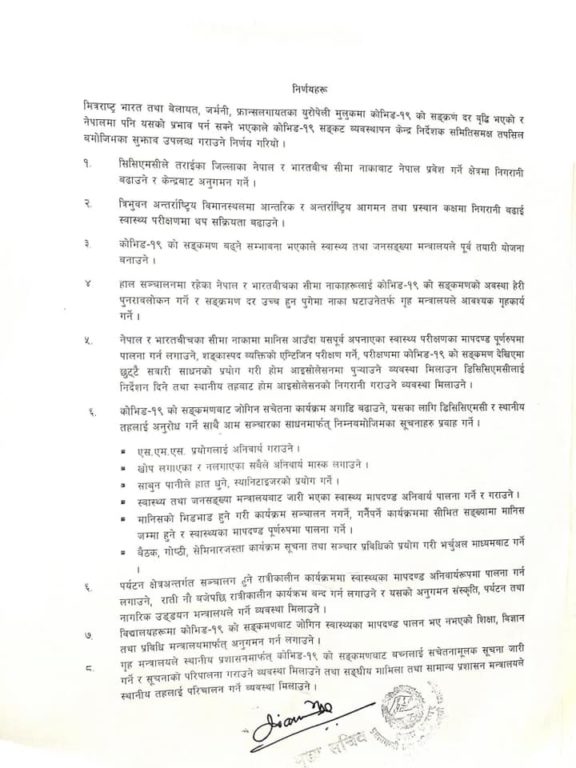 सुझाव पत्रमा भारतका सीमानाकाबाट नेपाल प्रवेश गर्ने नाकामा निगरानी बढाउने र केन्द्रबाट अनुगमन गर्ने, राति ९ बजेपछि हुने सबैखाले कार्यक्रम र जमघट बन्द गर्ने लगायतका सुझाव दिइएको छ ।