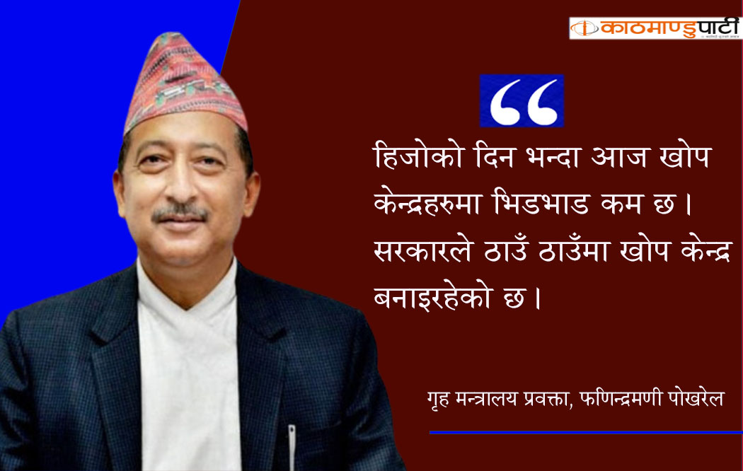 सरकारले भने खोप केन्द्रमा खोप लगाउनेहरुको भिडलाई स्वभाविक रुपमा लिएको छ । पछिल्लो समय कोरोना संक्रमणदर बढेकाले खोप लगाउनेको भिड स्वभाविक भएको गृहमन्त्रालयका प्रवक्ता फणिन्द्रमणी पोखरेलले काठमाण्डुपाटीलाई बताए ।उनले भने, ‘पछिल्लो समय नेपालमा कोरोना संक्रमणदर बढि रहेको छ । अब कोरोना संक्रमणदर बढे पछि खोप लगाउनेको भिड हुनु त स्वभाविक हो नी ।’