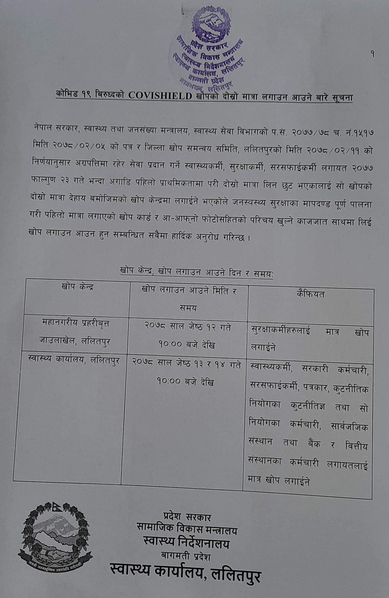 बागमती प्रदेशको सामाजिक विकास मन्त्रालय स्वास्थ्य कार्यालय ललितपुरले आज सूचना जारी गर्दै पहिलो मात्रा लगाएर दोस्रो मात्रा लगाउन छुटेका फ्रन्टलाइनर खटिनेहरुलाई बुधबारदेखि खोप लगाउने जनाएको हो ।