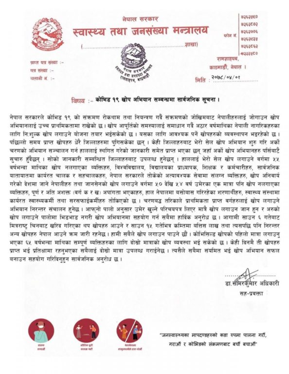 स्वास्थ्य मन्त्रालयले शुक्रबार एक विज्ञप्ति जारी गर्दै १८ वर्षमाथिका सबै नागरिकलाई खोप लगाउने योजना तयार भैसकेको जानकारी दिएको हो । मन्त्रालयका सह–प्रवक्ता डा. समिरकुमार अधिकारीले आवश्यक खोपकोसमेत व्यवस्थापन भैसकेको र केही जिल्लामा खोप पठाइसकिएको जानकारी दिए ।