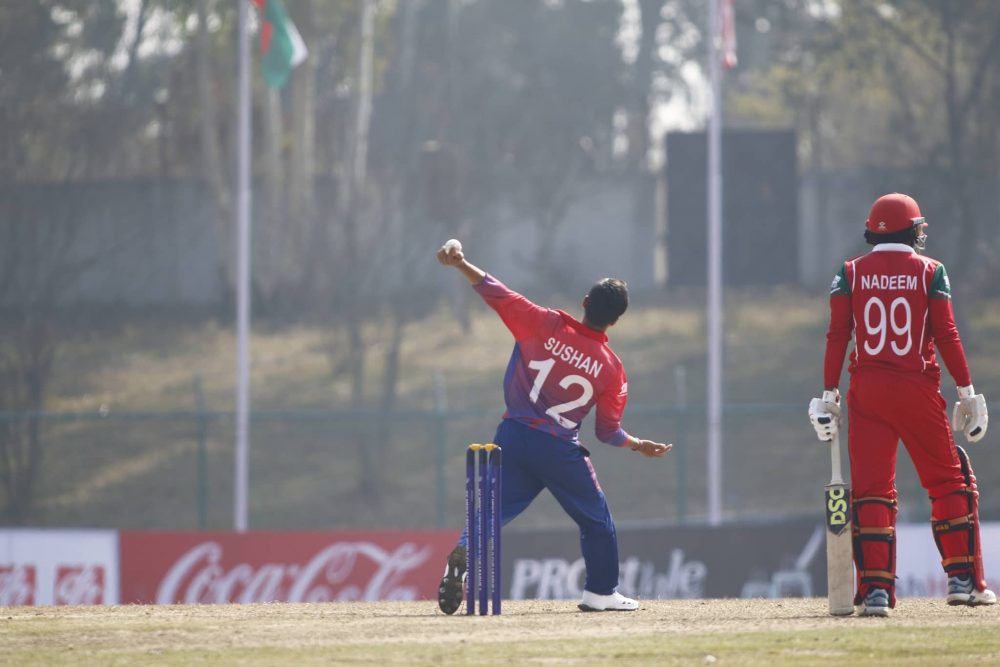 नेपालका लागि सुशन भारीले १ बलको फरकमा लगातार २ विकेट लिए । नेपालका लागि करन केसीले सुरुवाती २ विकेट लिएका थिए भने तेस्रो विकेटका रुपमा दीपेन्द्रसिंह ऐरीले ओमानका आकिब इलियासलाई रन आउट गरेका थिए ।