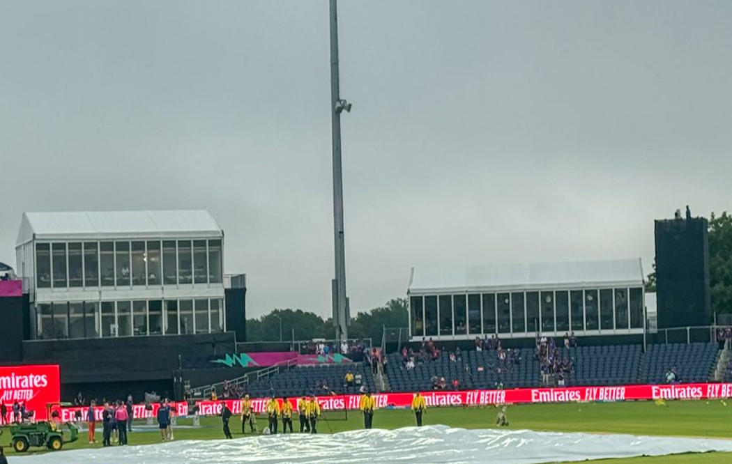 आइतबार न्यूयोर्कस्थित नसाउ काउन्टी इन्टरनेशनल क्रिकेट रंगशालामा नेपाली समय अनुसार राति ८ बजेबाट सुरु हुने भएको खेल बर्षा भएपछि ढिलो हुने भएको हो ।