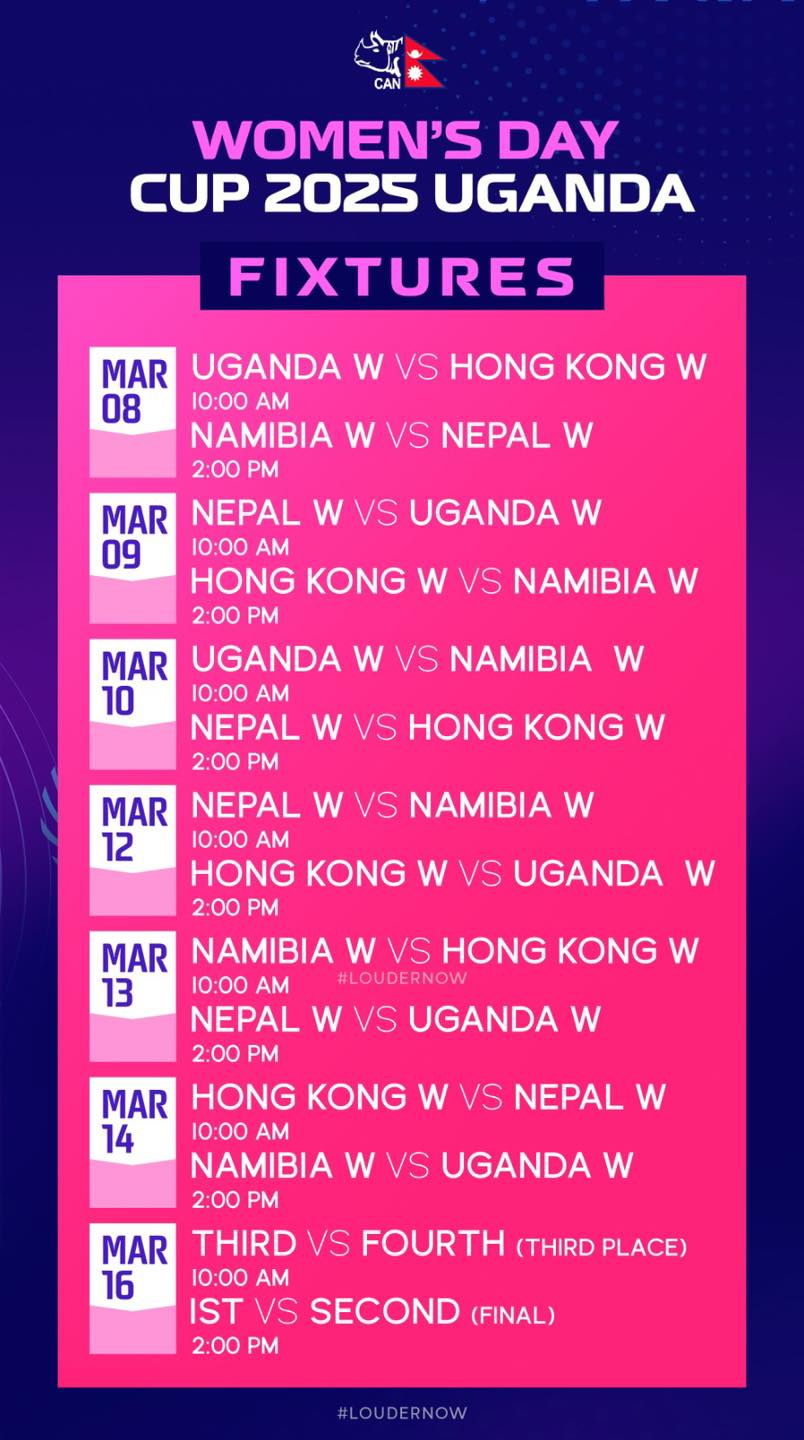 प्रतियोगितामा ८ मार्चमा नेपालले नामिबियासँग पहिलो खेल खेल्नेछ। यस्तै आयोजक युगान्डासँग ९ मार्च र हङकङसँग १० मार्चमा खेल हुनेछ।