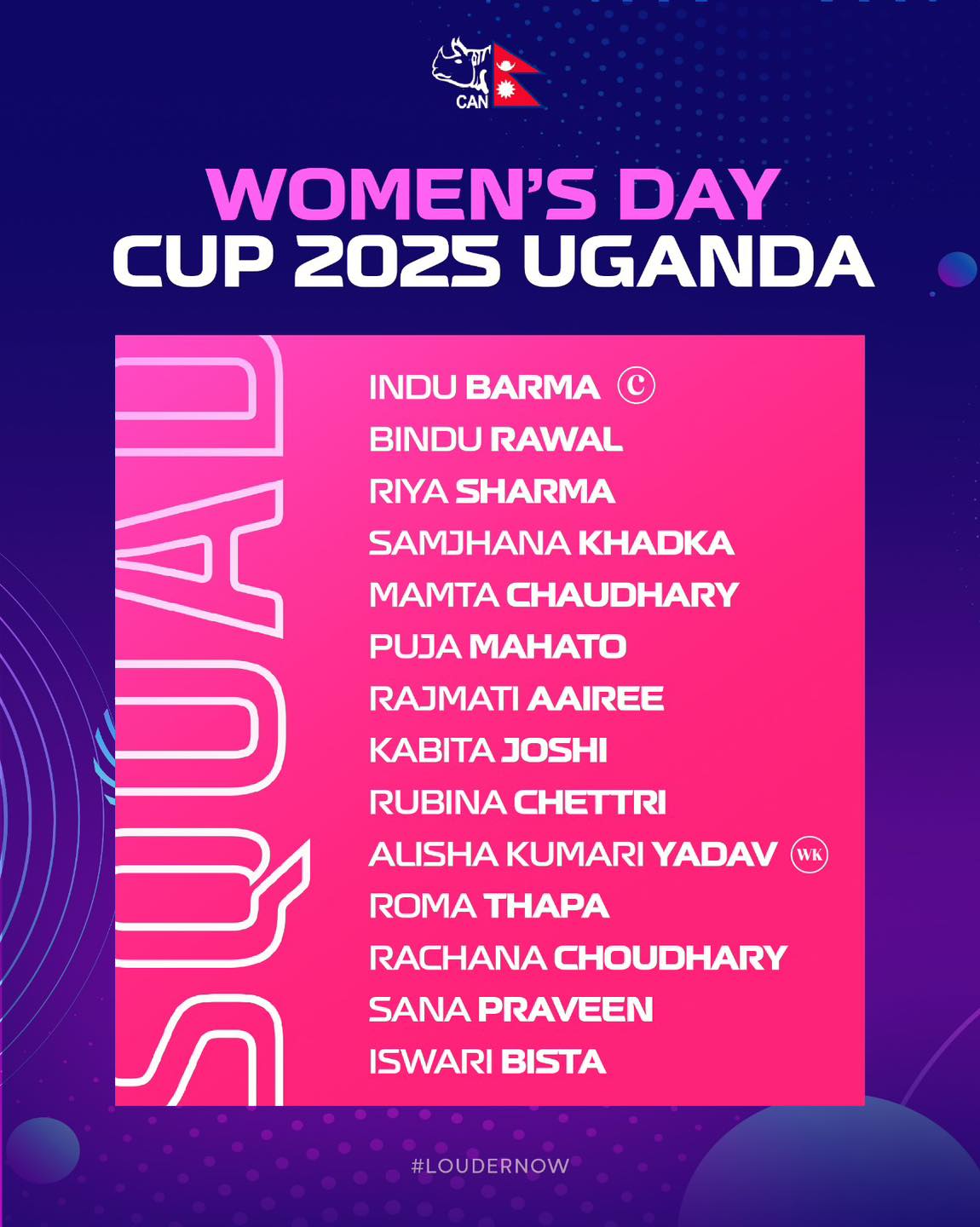 काठमाण्डु- युगान्डामा हुने ४ देशीय महिला क्रिकेट प्रतियोगितामा लागि नेपाली राष्ट्रिय टोली घोषणा गरिएको छ। नेपाल क्रिकेट संघ (क्यान)ले आइतबार साँझ १४ सदस्यीय टोली घोषणा गरेको हो ।