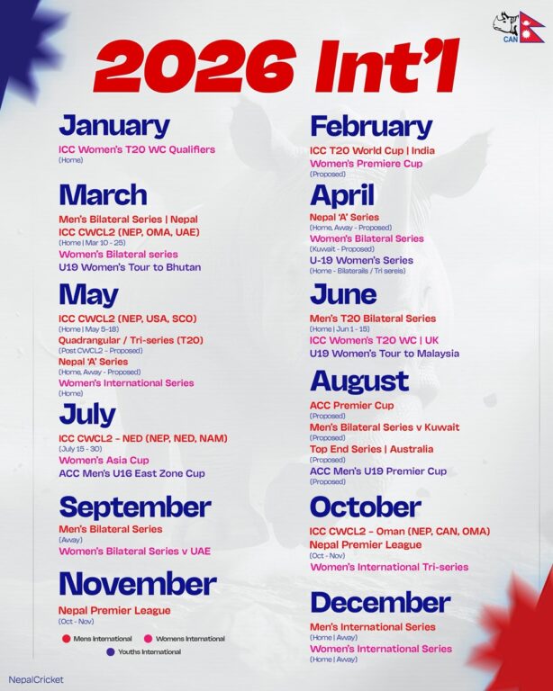 काठमाण्डु – नेपाल क्रिकेट संघ (क्यान)ले द्वारा २०२६ को खेल तालिका सार्वजनिक गरेको छ ।