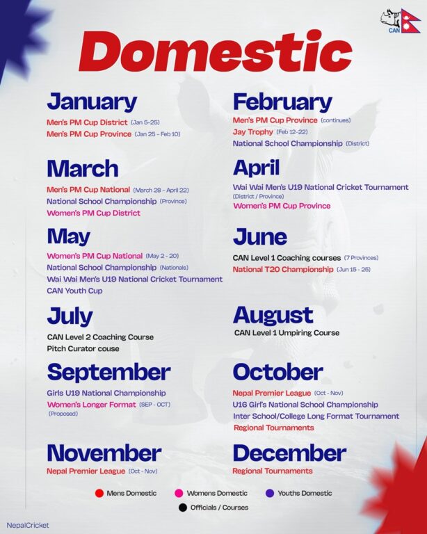 क्यानले शनिबार काठमाण्डुमा पत्रकार सम्मेलन गरी एक वर्ष पुरुष र महिला क्रिकेटको तालिका सार्वजनिक गरेको हो ।