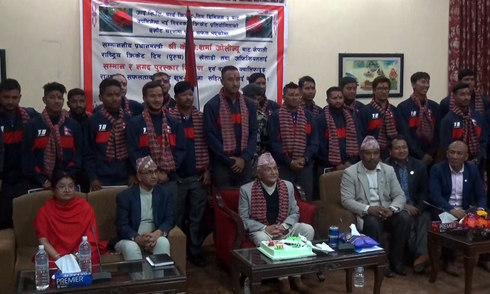 आईसीसी विश्व क्रिकेट लिग डिभिजन टू मा शीर्ष दुई भित्र रहन सफल नेपाली टिमका प्रत्यक सदस्यलाई प्रधानमन्त्री केपी शर्मा ओलीले अघिल्लो साता जनही तीन लाख दिने घोषणा गरेका थिए।