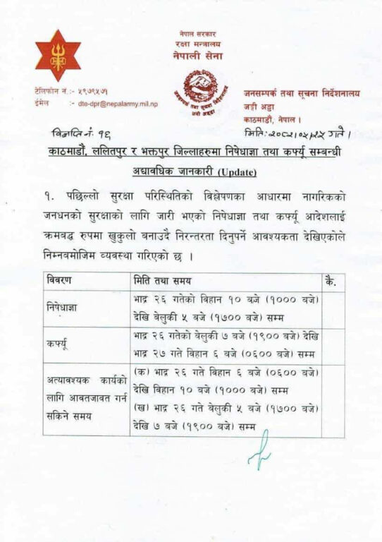 काठमाण्डौ उपत्यकाका तीन जिल्लामा बिहीबार बिहान १० बजेदेखि बेलुकी ५ बजेसम्म निषेधाज्ञा र बेलुकी ७ बजेदेखि शुक्रबार बिहान ६ बजेसम्मका लागि कर्फ्यू आदेश जारी भएको छ । नागरिकलाई अत्यावश्यक कार्यको लागिप. बिहीबार बिहान ६ बजेदेखि १० बजेसम्म र बेलुकी ५ बजेदेखि ७ बजेसम्म आवतजावत गर्न सकिने गरी समय निर्धारण गरिएको छ ।