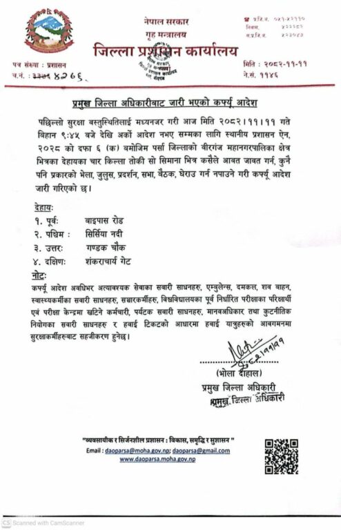 जिल्ला प्रशासन कार्यालय पर्साले पछिल्लो सुरक्षा वस्तुस्थितिलाई मध्यनजर गर्दै सोमबार बिहान १० बजेदेखि लागू हुने गरी महानगरका मुख्य क्षेत्रहरूमा अनिश्चितकालीन कर्फ्यु आदेश जारी गरेको हो।