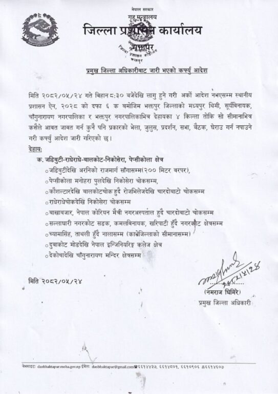 काठमाण्डु – जिल्ला प्रशासन कार्यालय भक्तपुरले पनि अनिश्चितकालीन कर्फ्यु आदेश जारी गरेको छ।