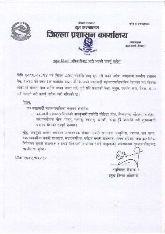 अर्को आदेश नभएसम्म स्थानीय प्रशासन ऐन बमोजिम काठमाण्डु जिल्लाको काठमाण्डु महानगरपालिकाभित्रका विभिन्न क्षेत्रमा मंगलबार बिहान ८ : ३० बजेबाट लागू हुने गरी कर्फ्यु आदेश जारी गरिएको हो।