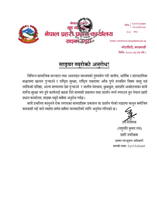 बुधबार साइबर ब्युरोका प्रहरी उपरीक्षक पशुपतिकुमार रायले सूचना प्रकाशन गरेर त्यस्ता सामग्री प्रकाशन गरेको पाइए कारबाही गर्ने चेतावनी दिएका छन् ।