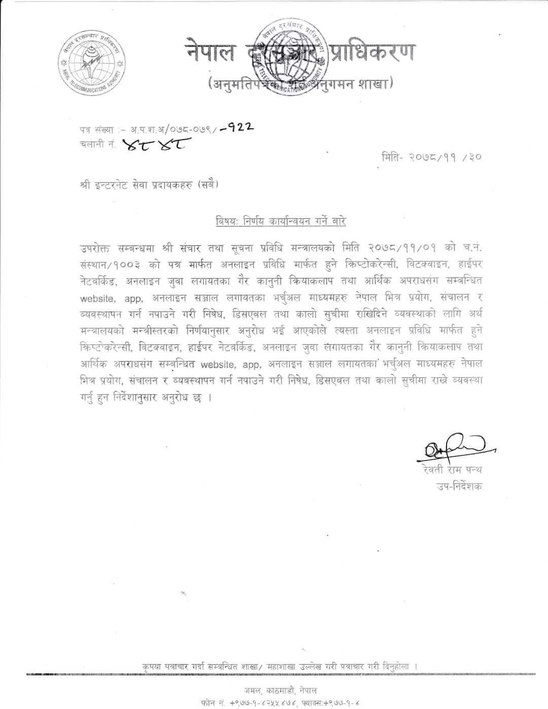 प्राधिकरणले एक पत्र लेख्दै क्रिप्टोकरेन्सीका एपहरूलाई नेपालभित्र प्रयोग, सञ्चालन र व्यवस्थापन गर्न नपाउने गरी निषेध, डिसएबल तथा कालोसूचीमा राख्न निर्देशन दिएको छ ।