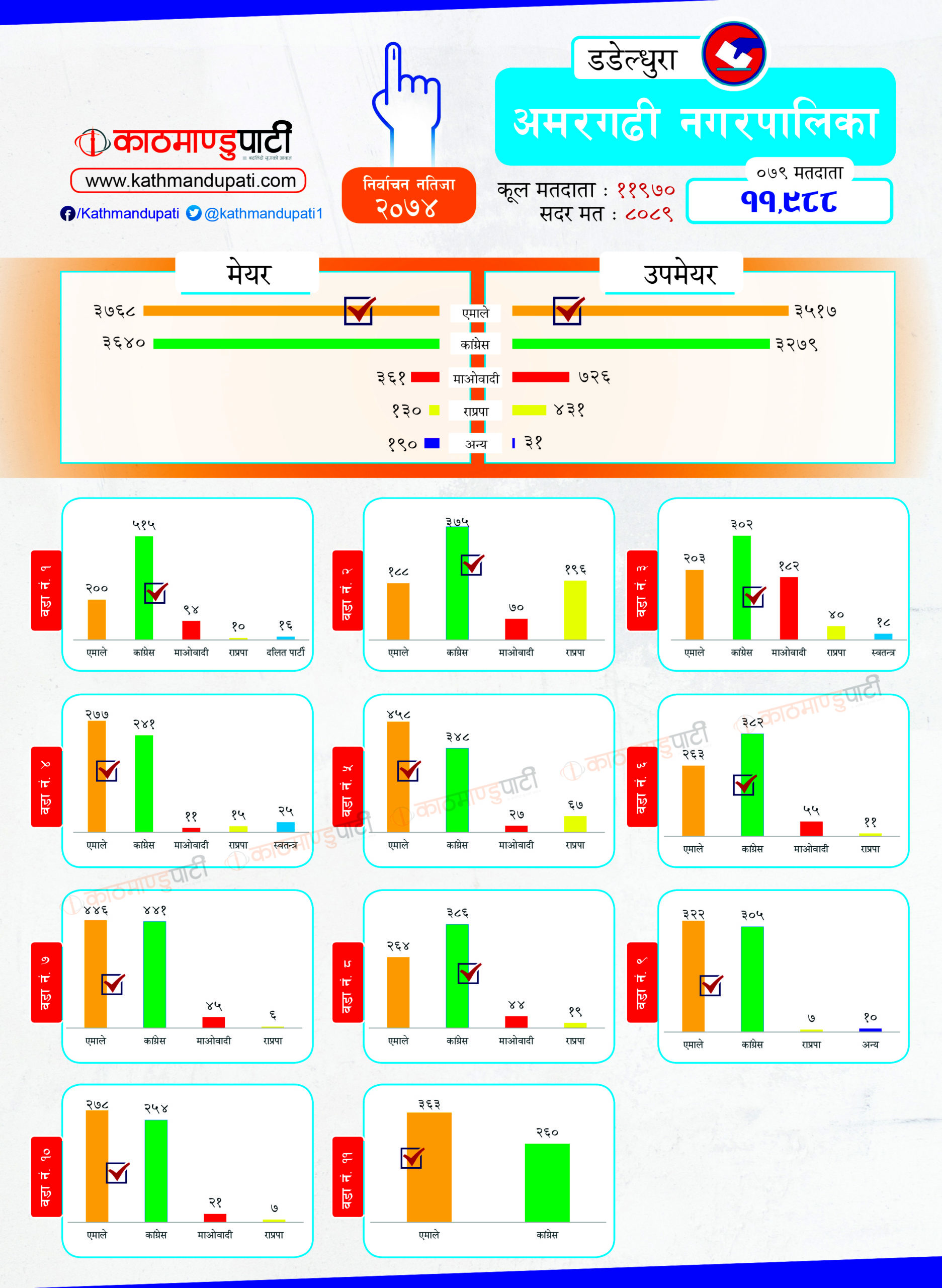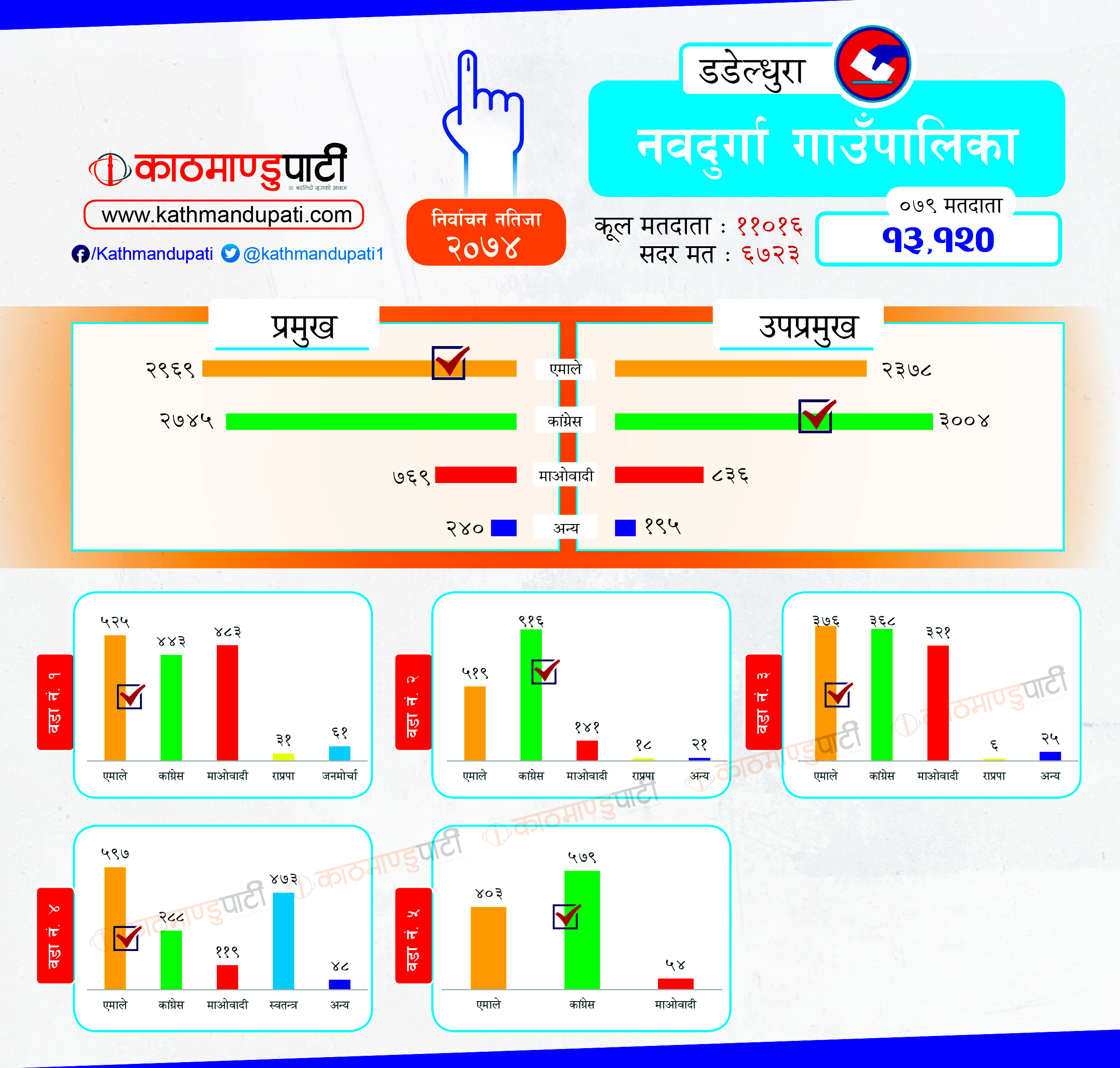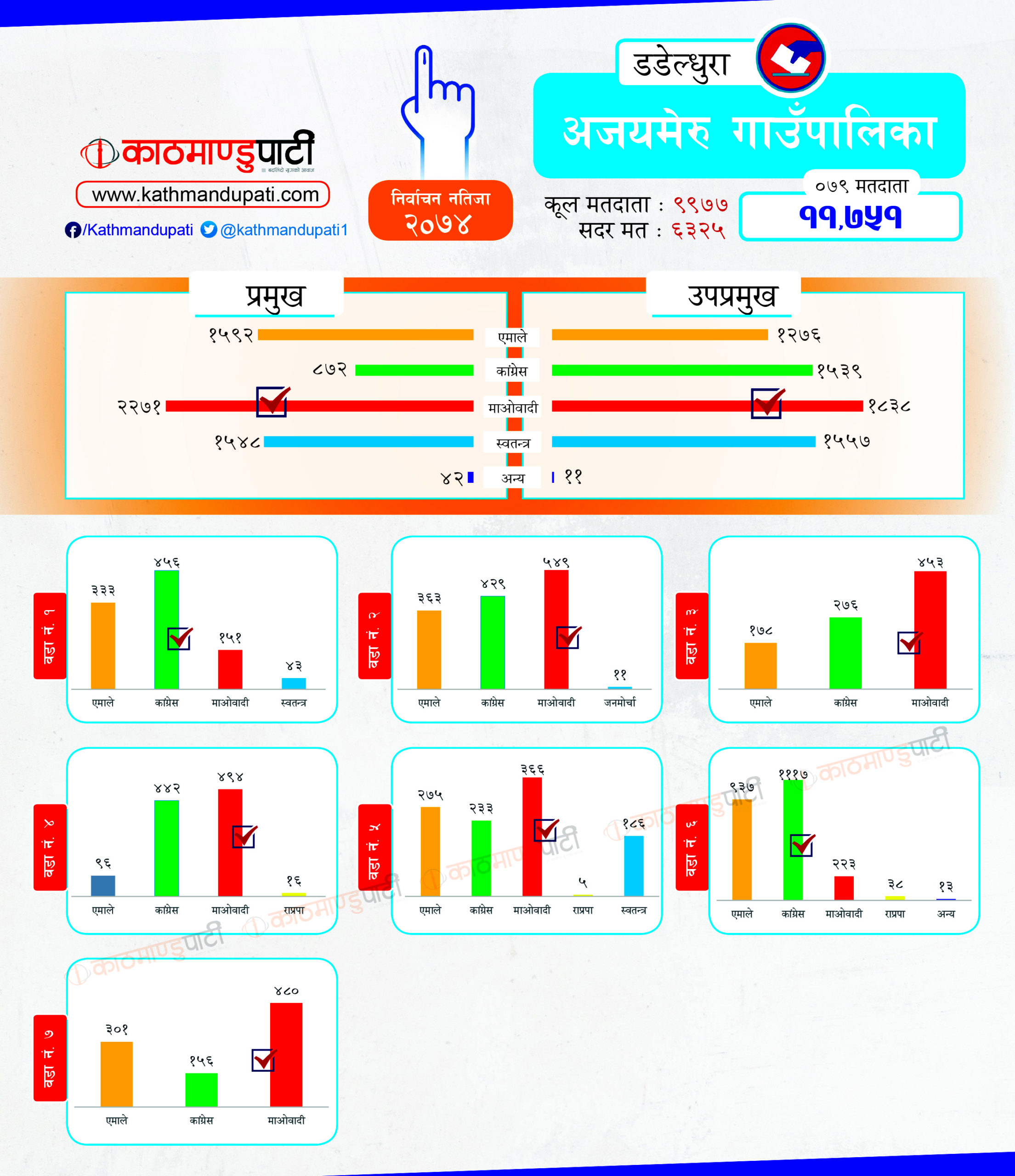 यस्तै, उसले नवदुर्गा गाउँपालिकामा उपाध्यक्षसमेत आफ्नो पोल्टामा पा¥यो । सदरमुकामसमेत रहेको अमरगढी नगरपालिकाको मेयर–उपमेयर नै एमालेले जित्यो । उसले नवदुर्गा गाउँपालिकाको अध्यक्षमा पनि बाजी मार्याे। माओवादीले भने अजयमेरु गाउँपालिकाका अध्यक्ष–उपाध्यक्ष जितेको थियो । त्यहाँ उसले एक्लै लडेर कांग्रेस र एमालेलाई पछि पारेको थियो ।