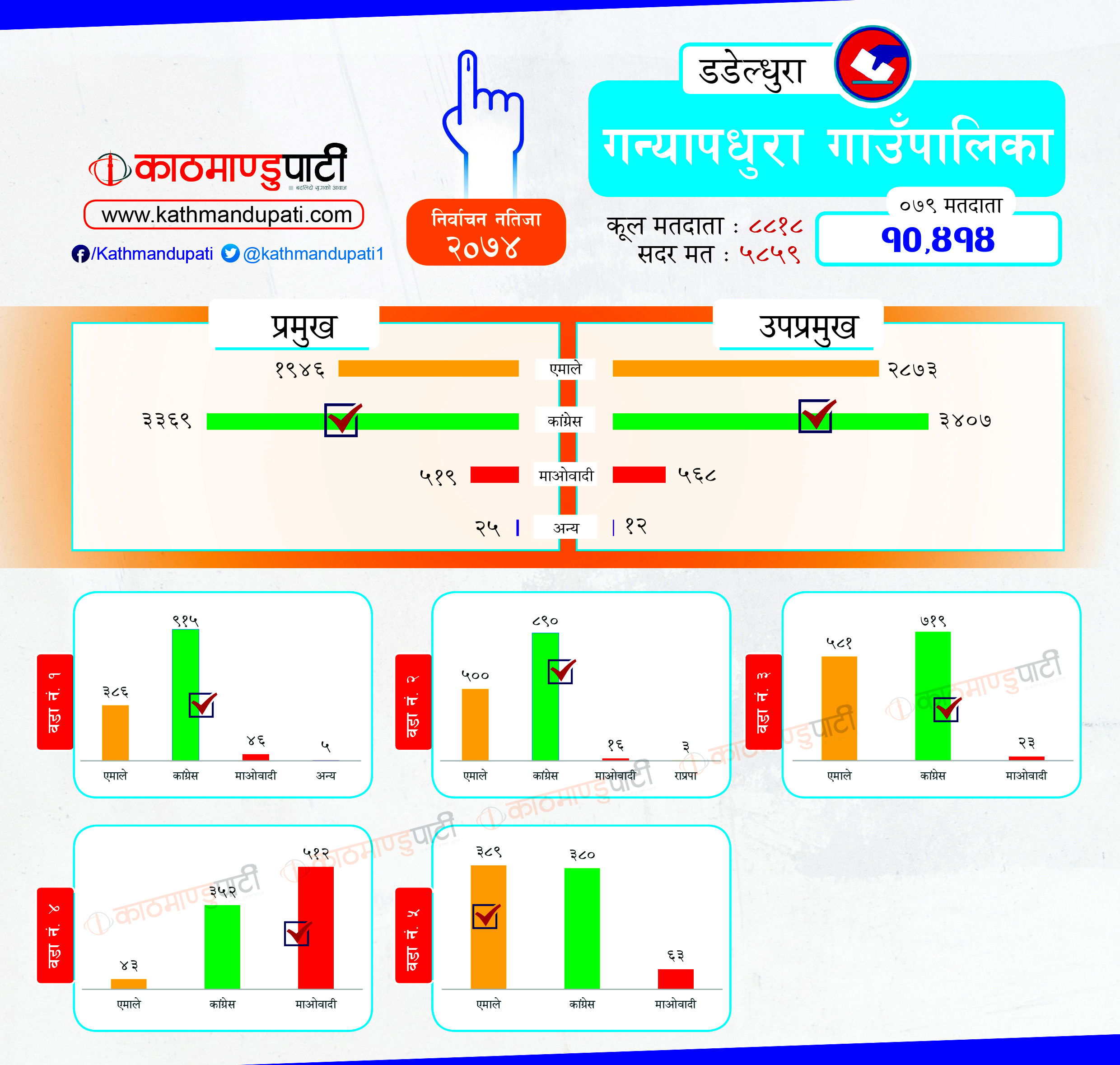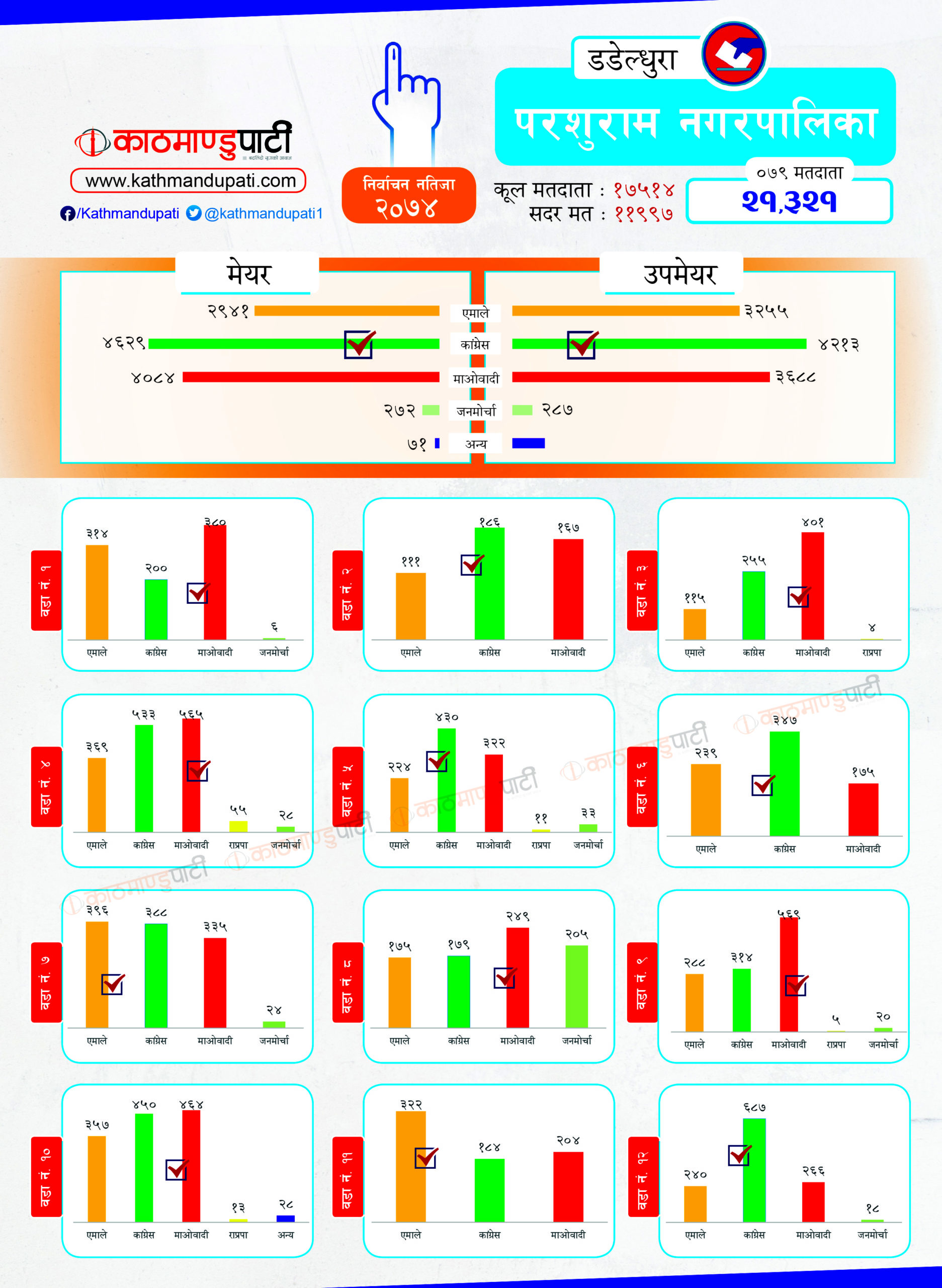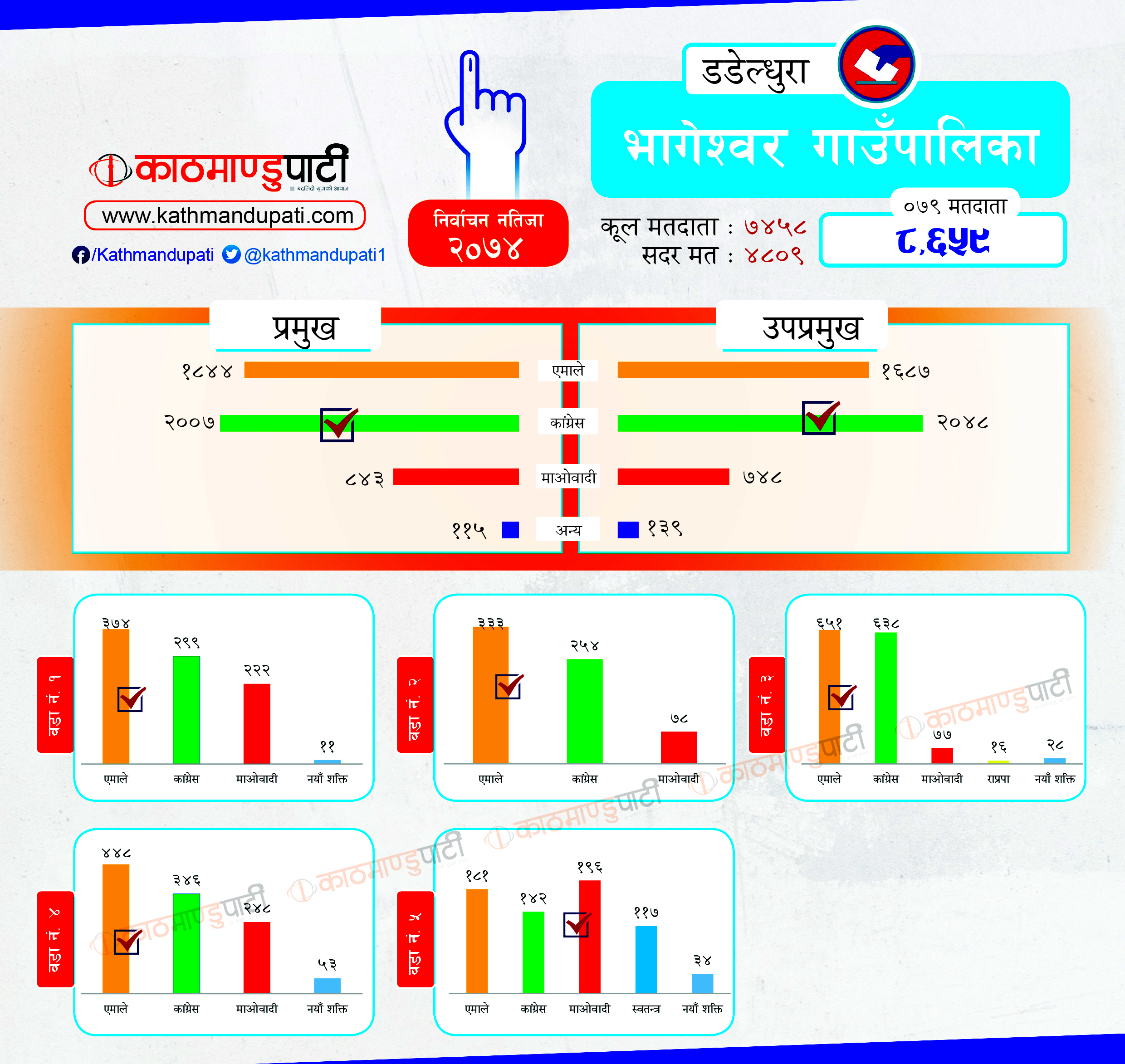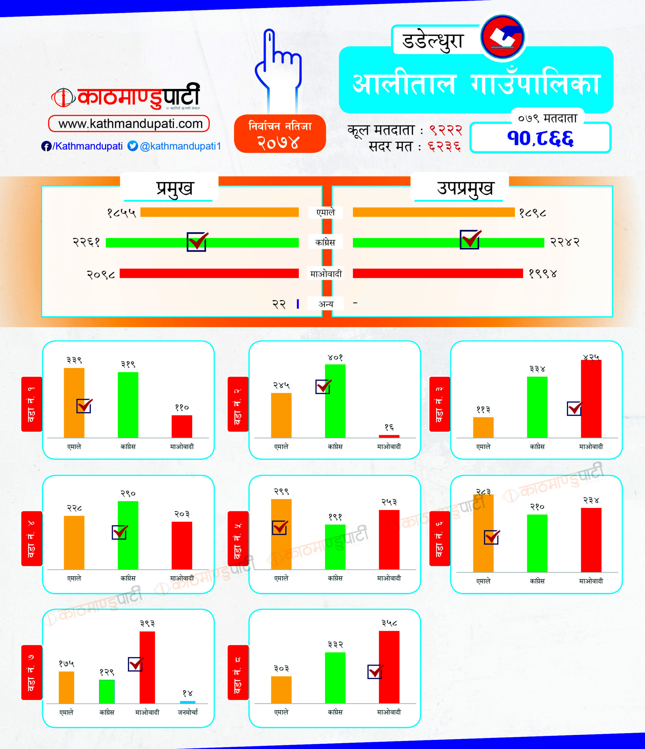 यस्तै, उसले नवदुर्गा गाउँपालिकामा उपाध्यक्षसमेत आफ्नो पोल्टामा पा¥यो । सदरमुकामसमेत रहेको अमरगढी नगरपालिकाको मेयर–उपमेयर नै एमालेले जित्यो । उसले नवदुर्गा गाउँपालिकाको अध्यक्षमा पनि बाजी मार्याे। माओवादीले भने अजयमेरु गाउँपालिकाका अध्यक्ष–उपाध्यक्ष जितेको थियो । त्यहाँ उसले एक्लै लडेर कांग्रेस र एमालेलाई पछि पारेको थियो ।