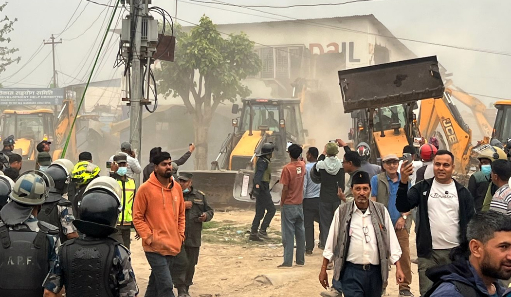 भक्तपुरतर्फको भागमा डोजर प्रयोग गरी बस्ती हटाउने क्रममा स्थानीयले विरोध जनाउँदै ढुंगामुढा प्रहार गरेका छन् । अतिक्रमित संरचना हटाउन पुगेका डोजर, सुरक्षाकर्मीमाथि ढुंगा प्रहार भएपछि अवस्था तनावपूर्ण बनेको छ ।
