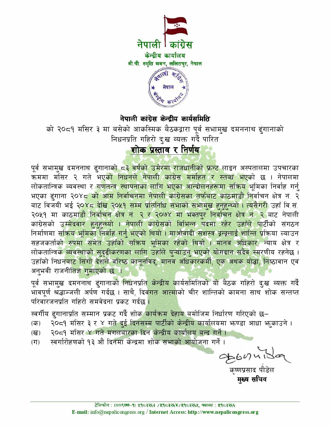काठमाण्डु – नेपाली कांग्रेसले पूर्वसभामुख दमननाथ ढुंगानाको निधनमा एक दिन पार्टी कार्यालय बन्द गर्ने निर्णय गरेको छ । केन्द्रीय कार्यालय सानेपामा सोमबार बसेको केन्द्रीय कार्यसमिति बैठकले मंसिर ३ र ४ गते कार्यालयमा झन्डा आधा झुकाउने निर्णय गरेको मुख्यसचिव कृष्णप्रसाद पौडेलले जानकारी दिए।