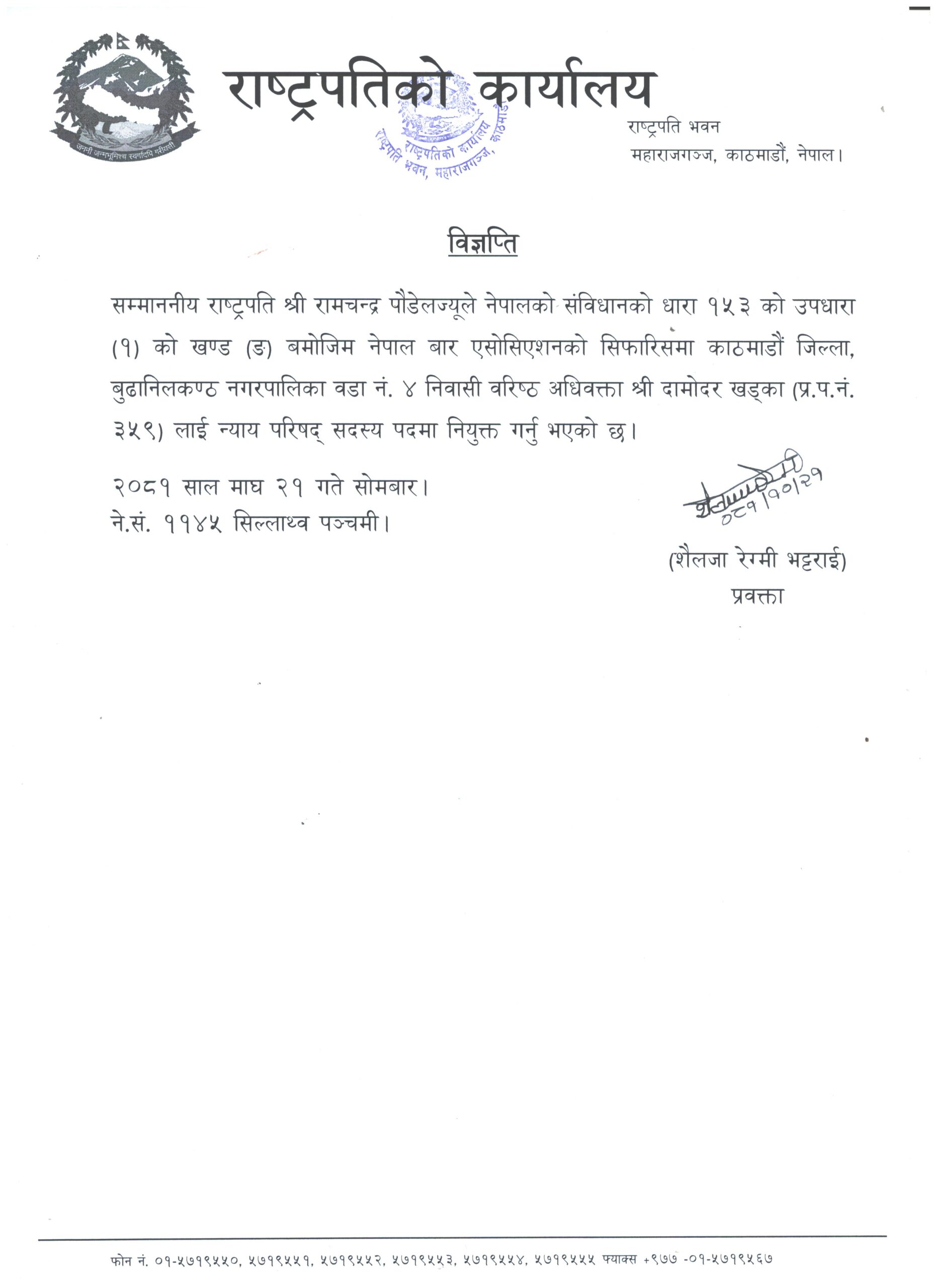 न्याय परिषद् सदस्यमा खड्का नियुक्त