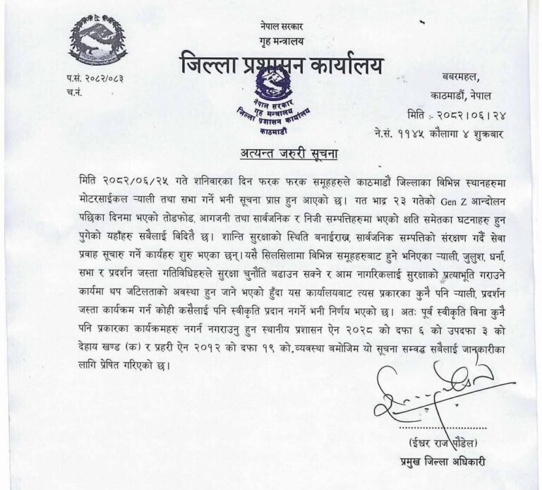 काठमाण्डु – जेनजी आन्दोलनपछि सुरक्षा चुनौती बढेको भन्दै काठमाण्डु जिल्ला प्रशासन कार्यालयले आगामी शनिबारका लागि तोकिएका मोटरसाइकल र्याली, सभा र प्रदर्शनजस्ता कार्यक्रमहरूलाई स्वीकृति नदिने निर्णय गरेको छ ।