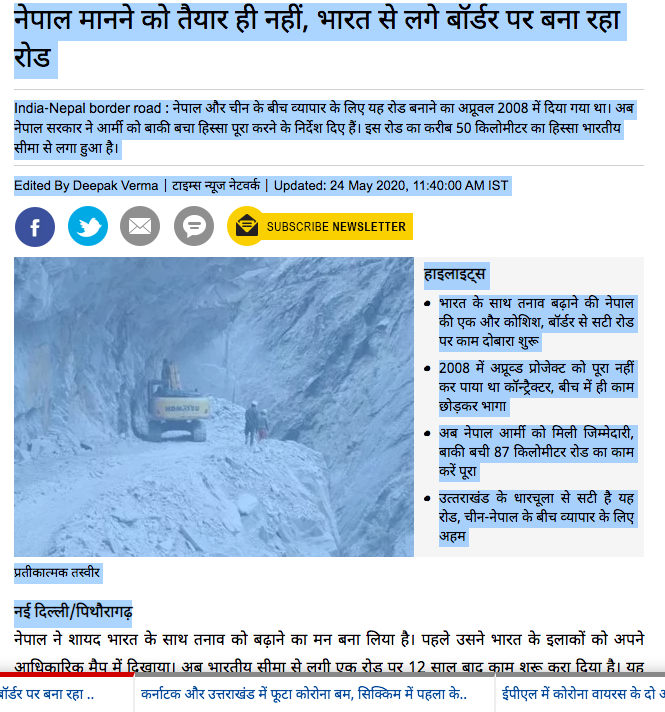 नवभारत टाइम्सले भने भारतसंग नेपालले तनाव बढाएको भन्दै भारतसंग जोडिएको सीमा क्षेत्रमा रोड बनाएको समाचार प्रकाशित गरेको छ । उसले विचमा नेपाली निर्माणकर्ता सड्क निर्माण ठेक्का पाएपनि घाटा लाग्ने भन्दै भागेको र ८७ किलोमिटर रोड बनाउने जिम्मा नेपाली सेनालाई मिलेको दावी गरेको छ । भारतको उत्तराखण्डसंग ५० किलोमिटर सिमा जोडिएको क्षेत्रमा व्यापार र धार्मिक पर्यटनलाई प्रवद्र्धन गर्न नेपालले सड्क बनाएको दावी समाचारमा छ ।
