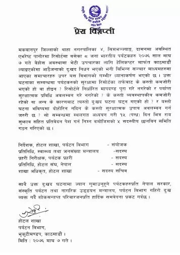 सदस्यमा होटल शाखाकै सदस्य सचिव तिलक रिजाल, पर्यटन प्रहरीका इन्सपेक्टर अस्मिता कपाली रहेका छन् । समितिमा स्वास्थ्य मन्त्रालय र होटल एसोसिएसन(हान)का एक एक जना प्रतिनिधि पनि रहेका छन् ।