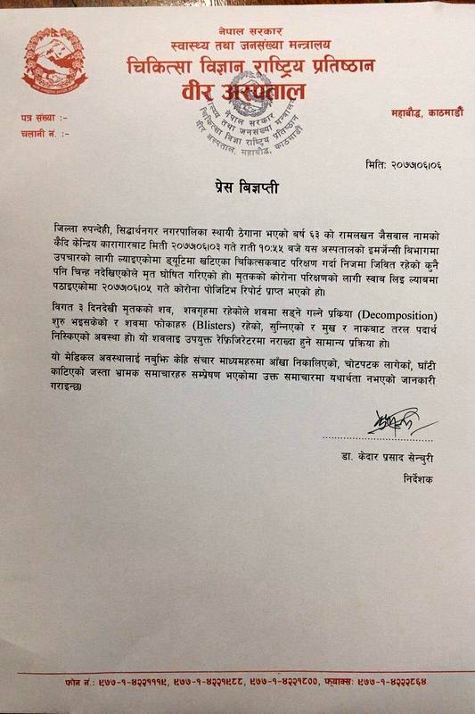 ‘विगत तीन दिनदेखि मृतकको शव शवगृहमा रहेकोले शवमा सड्ने गल्ने प्रक्रिया शुरु भइसकेको र शवमा फोकाहरु रहेको, सुन्निएको र मुखबाट तरल पदार्थ निस्किएको अवस्था हो । यो शवलाई उपयुक्त रेफ्रिजिरेटरमा नराख्दा हुने सामान्य प्रक्रिया हो’, विज्ञप्तिमा भनिएको छ ।