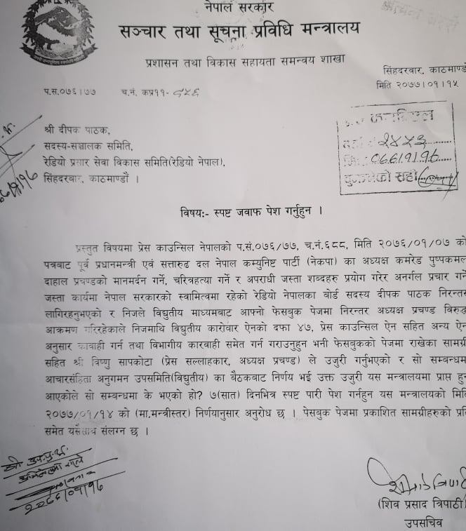 उनीमाथि साइबर क्राइमको अभियोग छ । प्रचण्डका तर्फबाट प्रेस सल्लाहकार विष्णु सापकोटाले छानवीन र कारवाहीका लागि प्रेस काउन्सिलमा केही दिन अघि उजुरी दायर गरेका थिएप्रधानमन्त्री केपी शर्मा ओलीको ठाडो आदेशमा उनलाई रेडियो नेपालमा नियुक्त गरिएको थियो । उनलाई यसअघि प्रेस काउन्सिलमा सदस्य पनि ओलीको जोडवलमा बनाइएको थियो। पछी अदालतले उनको नियुक्ती खारेज गरेको थियो ।