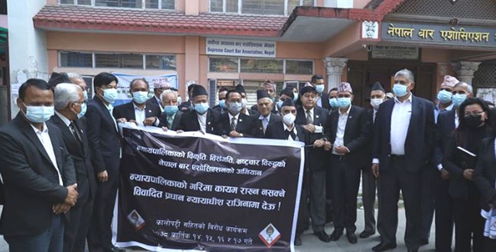 नेपाल बार एशोसिएसनको अगुवाइमा गरिएको प्रदर्शनमा कृष्णप्रसाद भण्डारी, दमननाथ ढुंगाना लगायत छन् । प्रदर्शनलाई लक्षित गरी सर्वोच्च अदालत परिसरमा सुरक्षा व्यवस्था कडा पारिएको छ । सर्वोच्च अदालत भित्र र बाहिर सुरक्षाकर्मीको तैनाथी बढाइएको छ ।