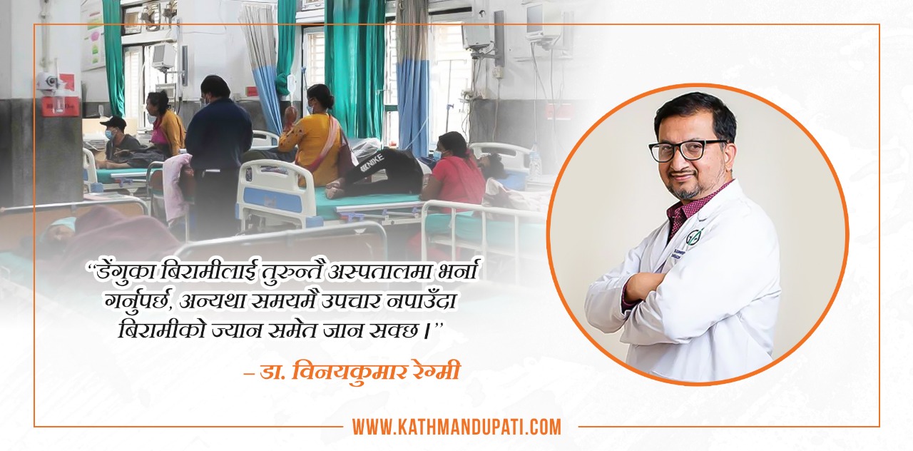 डेंगु आफैं निको हुने रोग हो । यसको कुनै स्पेसल उपचार छैन । डेंगुमा देखिएको लक्षणको उपचार गर्ने हो । डेंगुमा विशेषगरी प्रशस्त मात्रामा पानी खानुपर्छ, ‘ब्लड प्रेसर’ ध्यान दिएर जाँच गर्नुपर्छ ।