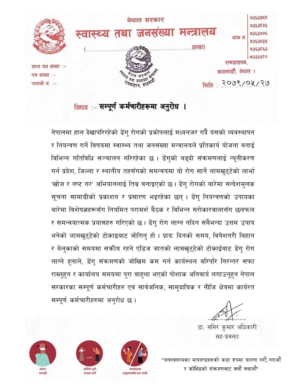 काठमाण्डु – स्वास्थ्य तथा जनसंख्या मन्त्रालयले डेंगुको प्रकोपबाट बच्न आफ्ना कर्मचारीलाई स्वास्थ्य टिप्स दिएको छ । उसले सोमबार दिउँसो एक विज्ञप्ति जारी गर्दै आफ्ना कर्मचारीलाई डेंगुबाट बच्न विभिन्न टिप्स दिएको हो ।