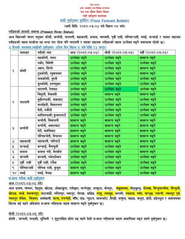 बाढी महाशाखाले जारी गरेको विज्ञप्तिअनुसार बुधबार इलाम, पाँचथर, तेह्रथुम, खोटाङ, ओखलढुंगा, रामेछाप, ताप्लेजुङ, धनकुटा, भोजपुर, संखुवासभा, सोलुखुम्बु, दोलखा, सिन्धुपाल्चोक, सिन्धुली, खोटाङ, काभ्रे, मकवानपुर, काठमाण्डु, ललितपुर, भक्तपुर, गोरखा, धादिङ, तनहुँ, लमजुङ, कास्की, स्याङ्जा, पर्वत, बागलुङ, म्याग्दी, नवलपुर‍पूर्व, नवलपुरपश्चिम, चितवन, अर्घाखाँची, पाल्पा, रुपन्देही, बाँके, दाङ, प्युठान, जाजरकोट, बैतडी, दार्चुला, बझाङ, बाजुरा, डोटी, डडेलधुरा र आसपासका जिल्ला भई बहने अधिकांश ससाना नदीहरूमा बहाब सामान्य बढ्ने पूर्वानुमान छ । महाशाखाले ती क्षेत्रका नदी तटीय क्षेत्रमा सतर्कता अपनाउनआग्रह पनि गरेको छ ।