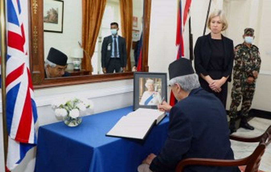 साथै, प्रधानमन्त्री देउवाले दूतावासमा राखिएको शोक पुस्तिकामा शोक सन्देश पनि लेखेका छन् । महारानी एलिजावेथ द्धितीयकोे बिहीबार ९६ वर्षको उमेरमा निधन भएको थियो । उनको निधनप्रति विश्व नेताहरुले समवेदना व्यक्त गरेका छन् ।