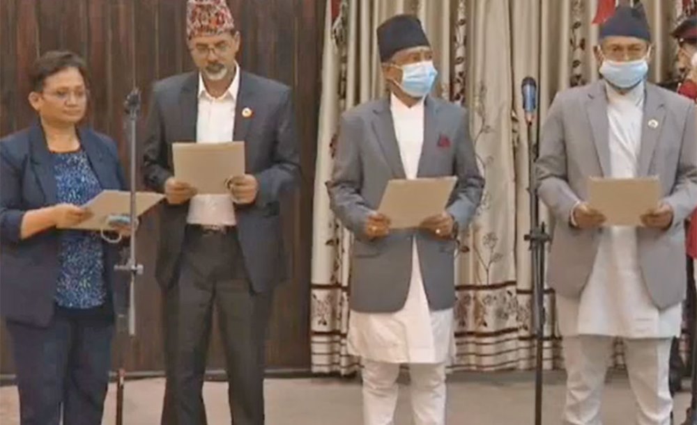 मंगलबार साँझ शीतल निवासमा आयोजित विशेष समारोहमा राष्ट्रपति विद्यादेवी भण्डारीसामु देउवासहित चार मन्त्रीले पद तथा गोपनीयताको शपथ लिएका हुन् । सर्वोच्च अदालतको फैसलापछि राष्ट्रपति भण्डारीले मंगलबार दिउँसो देउवालाई प्रधानमन्त्रीमा नियुक्त गरेकी हुन् ।