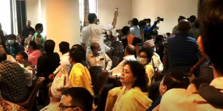 उद्घोषकले प्रधानमन्त्री देउवालाई मन्तव्य दिन बोलाएपछि केही व्यक्तिले नाराबाजी गरे। कार्यक्रम स्थलमा नाराबाजी हुन थालेपछि सुरक्षाकर्मीले प्रधानमन्त्री देउवालाई सुरक्षित तवरले मन्तव्य स्थानसम्म पुर्याएका छन्।
