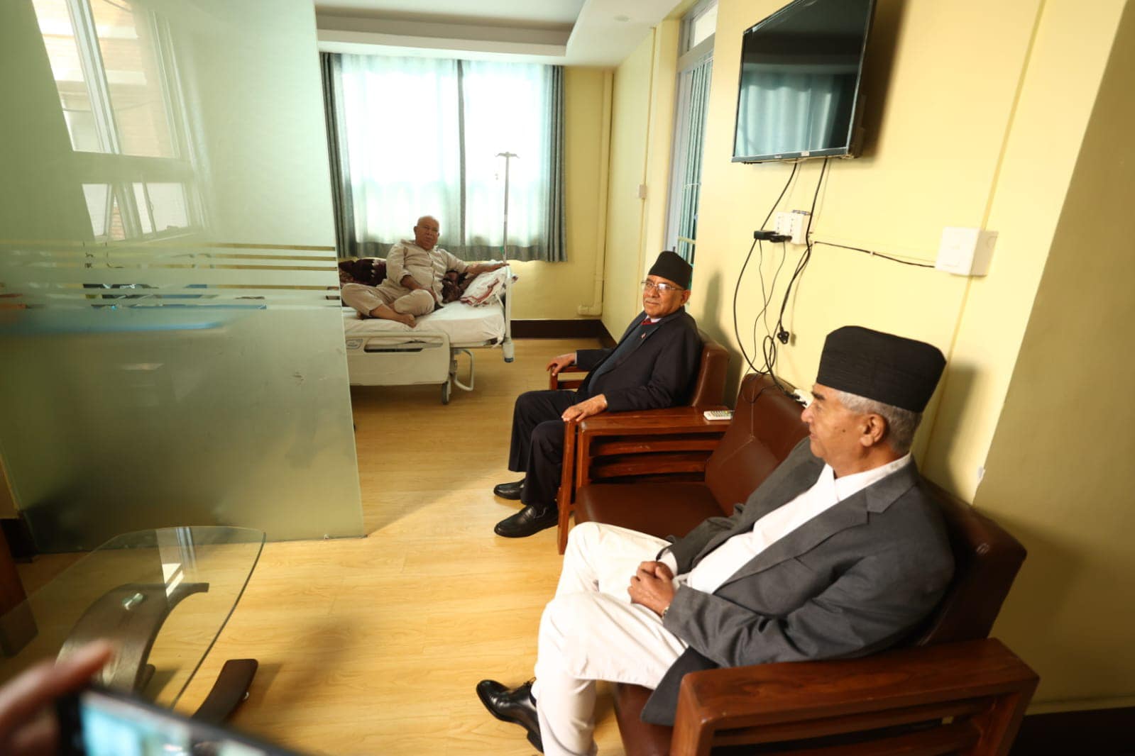 माधव नेपाललाई भेट्न अस्पताल पुगे देउवा र प्रचण्ड